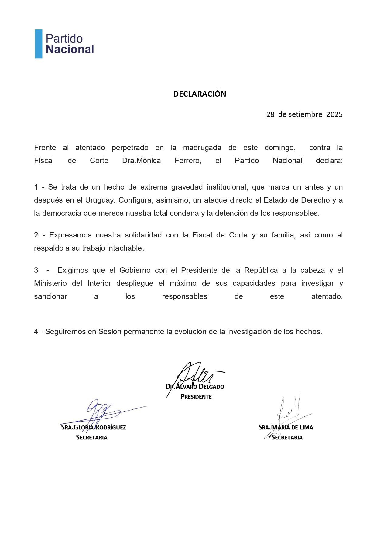 Declaración del Partido Nacional frente al atentado perpetrado contra la Fiscal de Corte Dra. Mónica Ferrero.