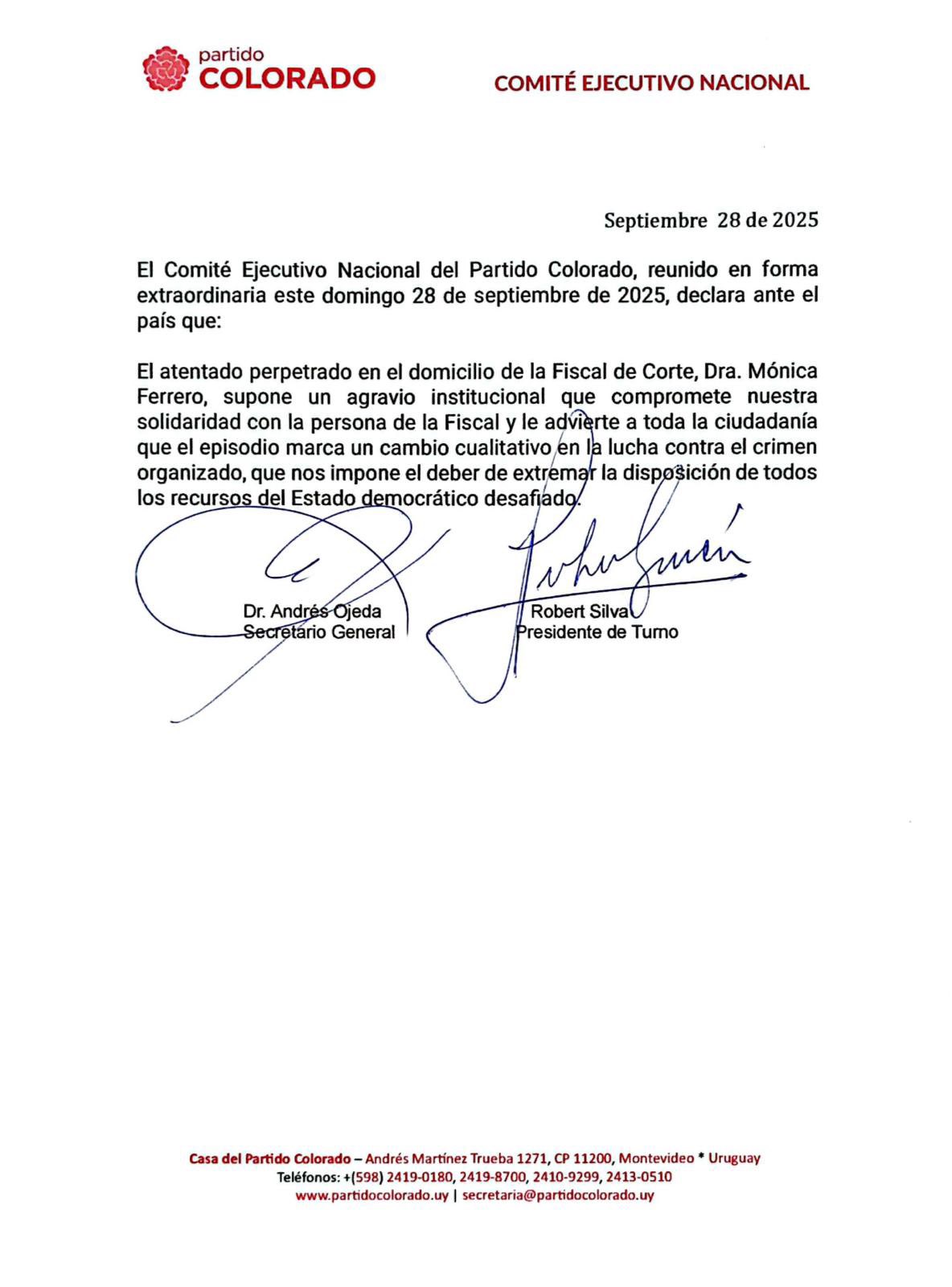 El CEN del Partido Colorado repudia el atentado contra la Fiscal de Corte Mónica Ferrero