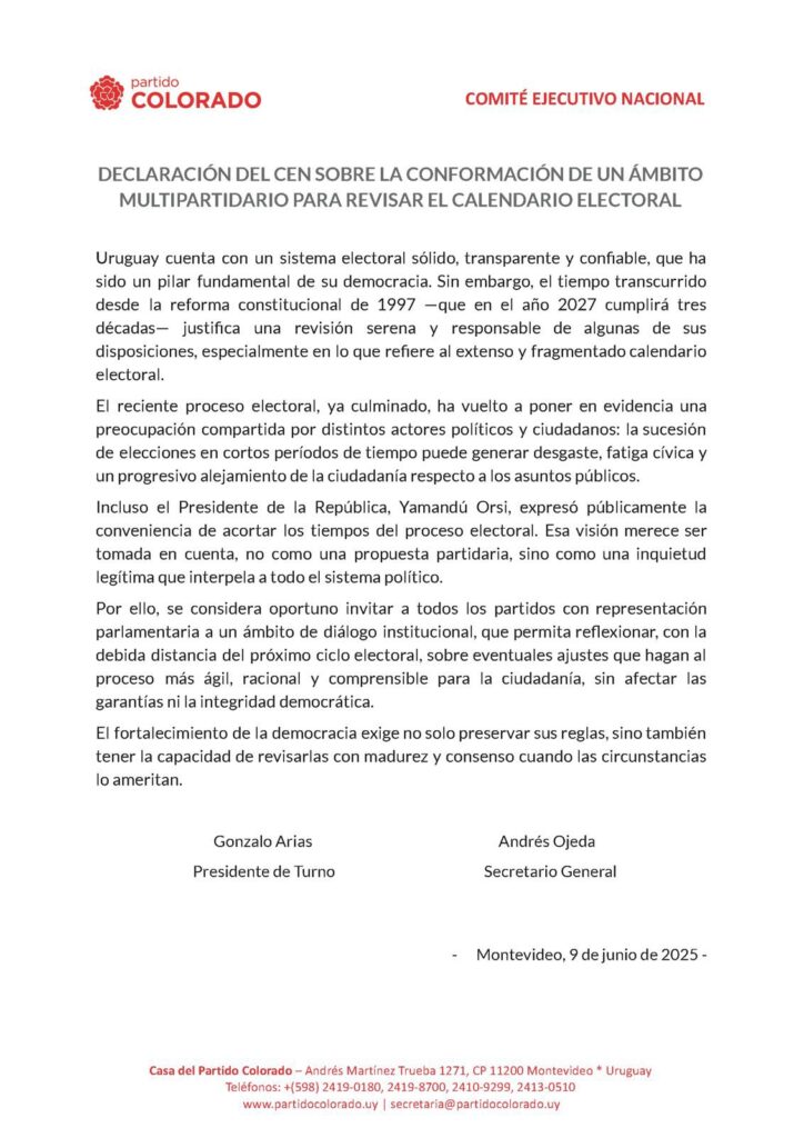 El Partido Colorado propone abrir un diálogo multipartidario para revisar el calendario electoral y tras la reunión de su Comité Ejecutivo Nacional (CEN) publicó un comunicado en el que expresa su iniciativa.