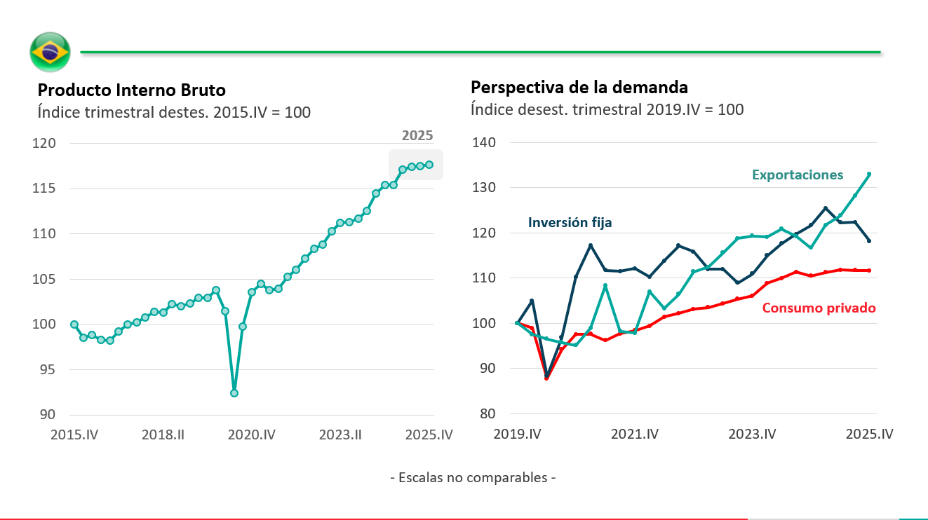 EMILIANO COTELO (EC): A principios de mes se conocieron los datos de cierre de 2025 de crecimiento de Brasil: la economía creció 2,3% en el promedio del año, pero con una clara desaceleración en la última mitad.
