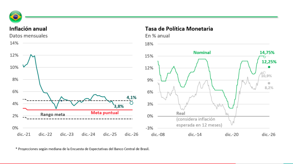 De todos modos, es importante marcar que, incluso si se concretan los recortes que hoy espera el mercado (con una Selic en torno a 12,25% a fin de año) la tasa real seguiría en niveles muy elevados, más o menos en 8%. Es decir, la política monetaria en Brasil va a seguir siendo restrictiva durante todo 2026, aunque algo menos que ahora.