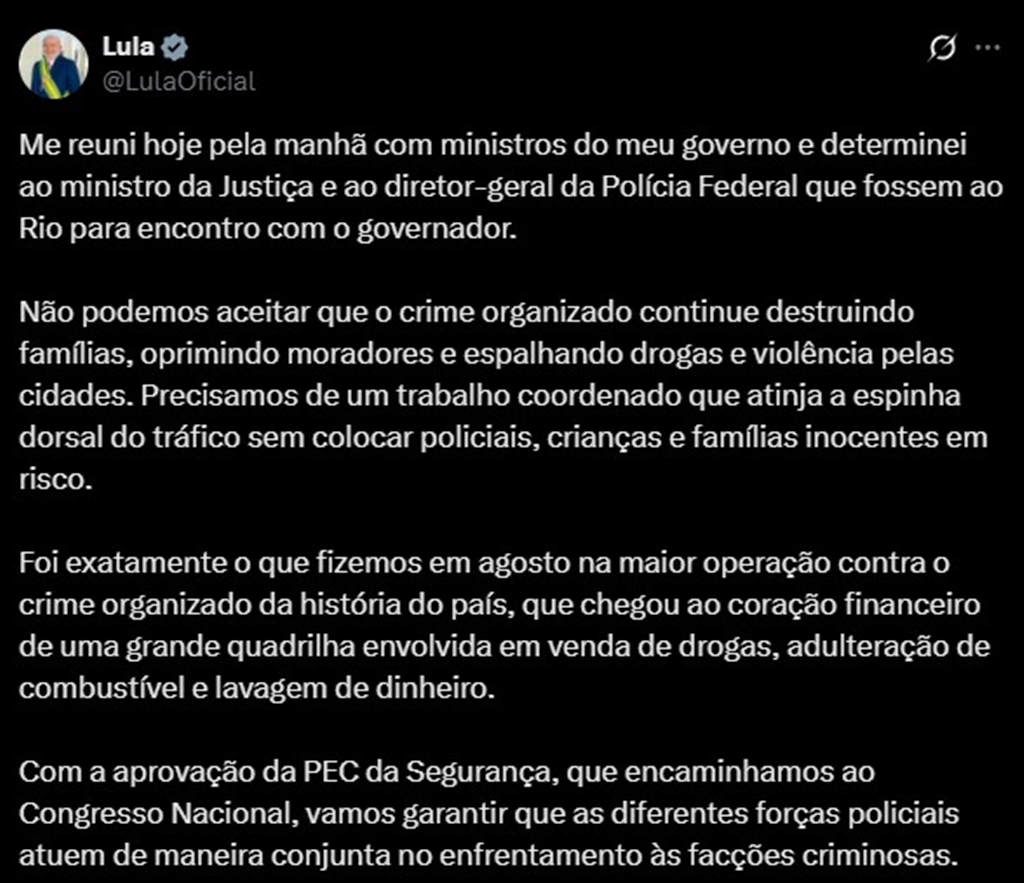 "No podemos aceptar que el crimen organizado continúe destruyendo familias, oprimiendo vecinos y esparciendo drogas y violencia por las ciudades", afirmó Lula. En ese marco, llamó a “un trabajo coordinado que alcance a la columna vertebral del tráfico sin poner a policías, niños y familias inocentes en riesgo".