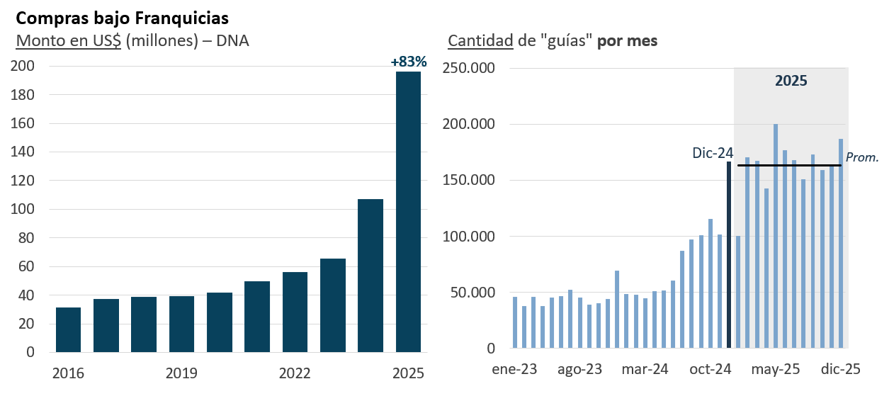 Así, en 2024 se registraron casi 975.000 compras bajo franquicia por algo más de US$ 100 millones, duplicándose los niveles promedio de los 8 años anteriores.