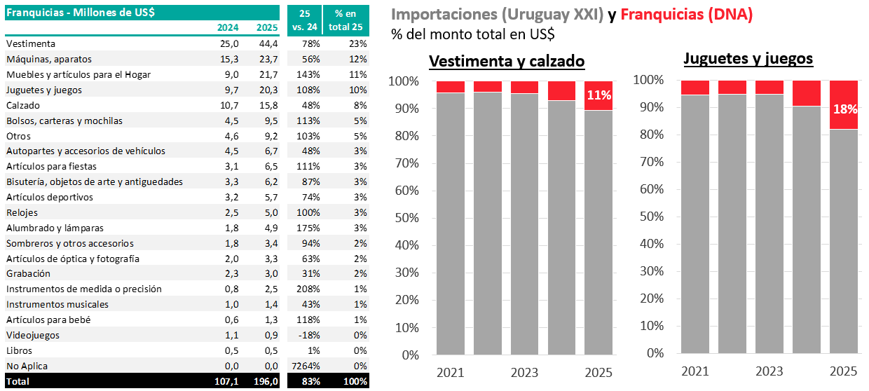 DM: Lo más comprado por franquicias es vestimenta. Y no solo en 2025, sino que históricamente eso ha sido así. Si le sumamos calzado, el año pasado, la indumentaria representó el 31% de las compras totales, esto es, unos US$ 60 millones. Los otros 3 rubros más relevantes son lo que la aduana denomina “máquinas/aparatos” (que se puede suponer son pequeños electrodomésticos o artículos de tecnología), juguetes y juegos y artículos para el hogar. Estos 3 rubros representaron entre el 10% y el 12% del total cada uno… esto es entre US$ 20 y 24 millones en cada caso en el año.