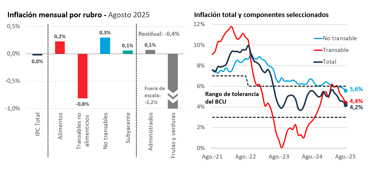 ALICIA CORCOLL (AC): Así es, tuvimos una inflación negativa en el mes (es decir, deflación), por 0,03% en agosto, nula si redondeamos. En ese bajo registro mensual fue determinante la caída del tipo de cambio, que recordemos acumula una caída de más de 5% desde abril y de casi 10% en lo que va del año. Esto impacta directamente en lo que llamamos el componente transable de la canasta del Índice de Precios del Consumo. Esos precios cayeron de hecho 0,2% en el mes. También tuvo gran incidencia el abaratamiento de las frutas y verduras, de 2,2% en el mes.