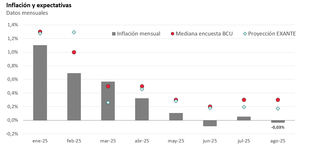 AC: Sí. Este año las sorpresas fueron sistemáticamente a la baja: casi todos los meses la inflación estuvo por debajo de lo previsto, tanto en nuestros pronósticos en EXANTE como en la mediana de expectativas del Banco Central. Desde abril la diferencia ronda entre 2 y 3 décimas por mes, acumulando una brecha importante. Para ilustrarlo: en marzo proyectábamos una inflación de 2,1% para el semestre marzo-agosto, la mediana del Banco Central marcaba una inflación de 2,4%, y la inflación efectiva terminó siendo en el acumulado de todos esos meses de apenas 1%.