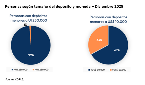 Dicho eso, la cobertura efectiva es alta para los depositantes más chicos: a fines de 2025, el 99% de las personas tenían sus depósitos en moneda nacional totalmente cubiertos y en moneda extranjera eso ocurría con el 67% de las personas.