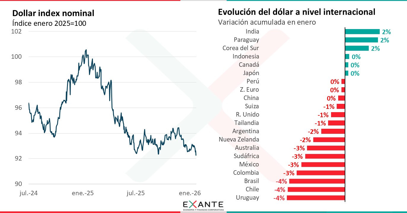MC: En Uruguay decíamos que el dólar acumuló una caída de 4% en enero. Eso estuvo muy en línea con lo que hizo la divisa estadounidense frente a otras monedas de nuestra región. Para poner algunos ejemplos, el dólar cayó entre 3% y 4% frente a las divisas de Colombia, Brasil, Chile y México.
