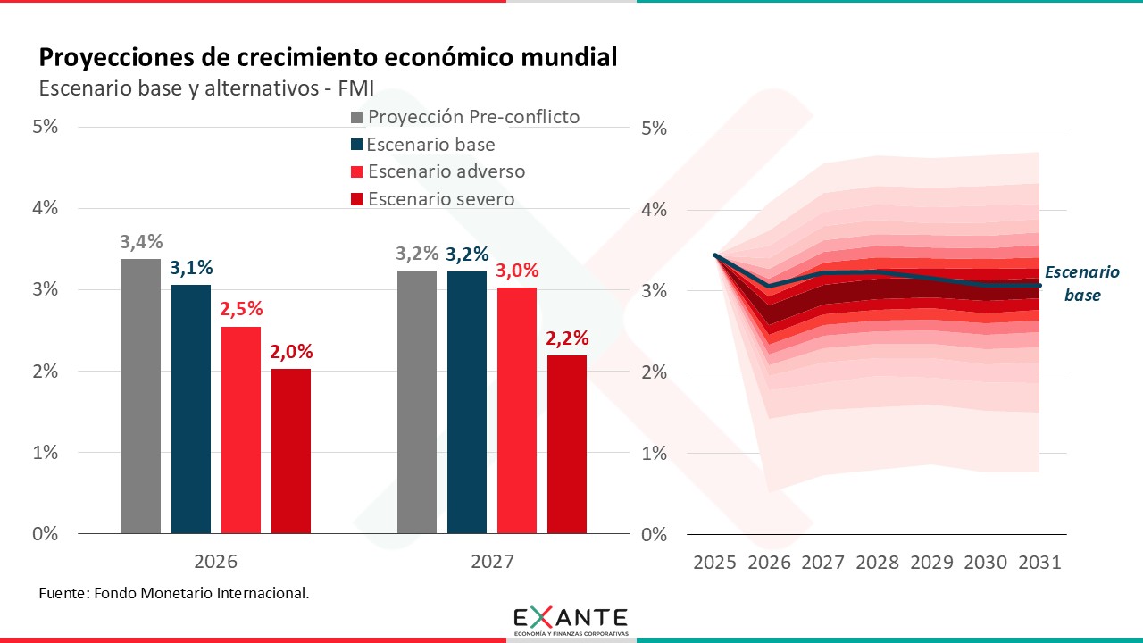 El escenario de referencia del FMI apunta a un crecimiento promedio de 3,1% para este año, inferior al 3,4% que se estimaba de no haber mediado el conflicto.