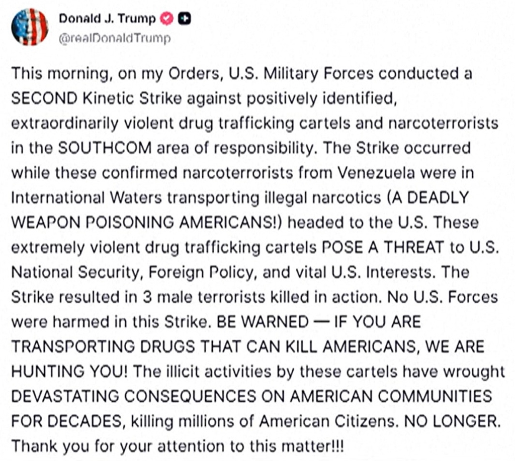 El presidente de Estados Unidos, Donald Trump, destacó ayer que su país ya "eliminó" a tres embarcaciones frente a Venezuela, un día después de confirmar un segundo ataque de sus fuerzas armadas contra lanchas que presuntamente traficaban droga en el Mar Caribe.