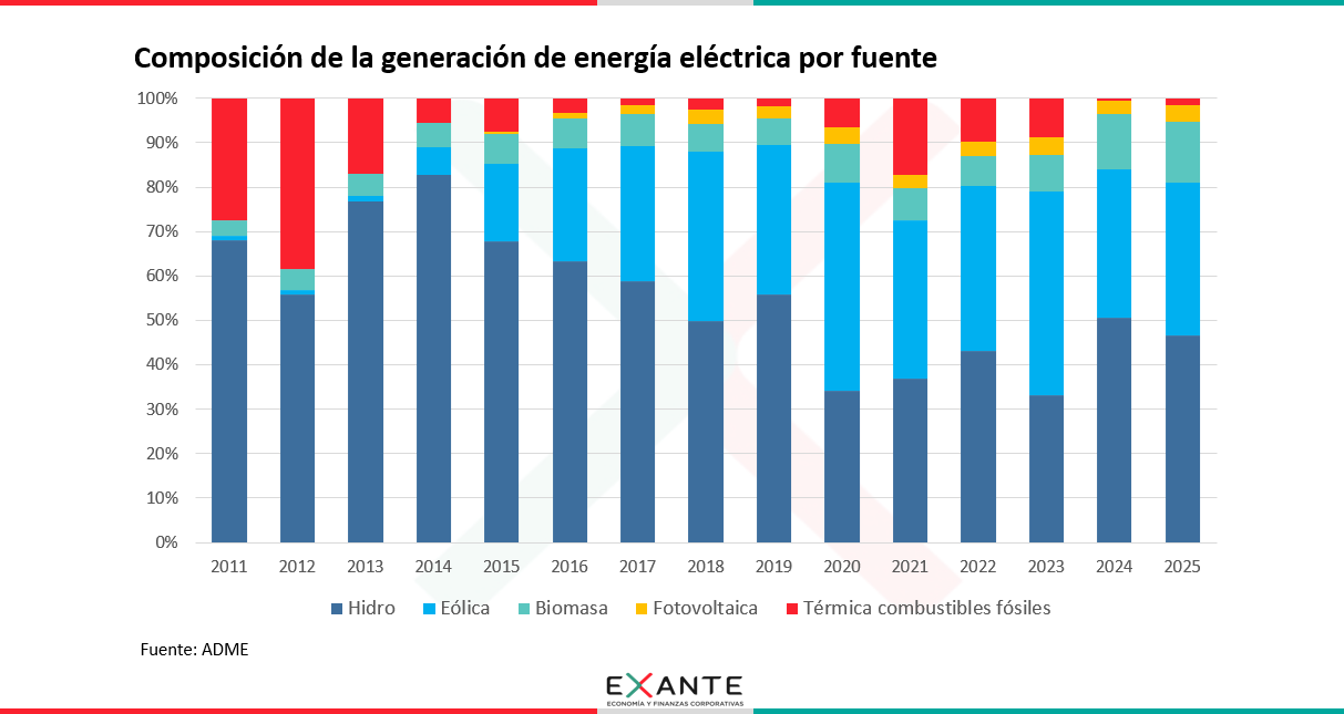 Dentro de ese total, la energía hidroeléctrica representó un 47% de la producción, un peso similar al de 2024 y sensiblemente mayor al de 2023, cuando la sequía redujo los caudales en las represas y esta fuente aportó solo un 33% en el promedio anual, llegando incluso a mínimos cercanos al 15% en los meses más críticos. La energía eólica, ya muy consolidada, explicó un 35% del total; la solar fotovoltaica aportó un 4%; y la generación a partir de biomasa representó el 14%. El 1% restante se produjo en centrales térmicas a partir de combustibles fósiles. Y de nuevo comparo con 2023, que fue un año climáticamente atípico, en el que esta fuente llegó a representar cerca de un 10% de la generación anual (con algunos meses puntuales donde incluso alcanzó a un 25%-30% del total).