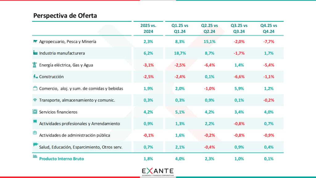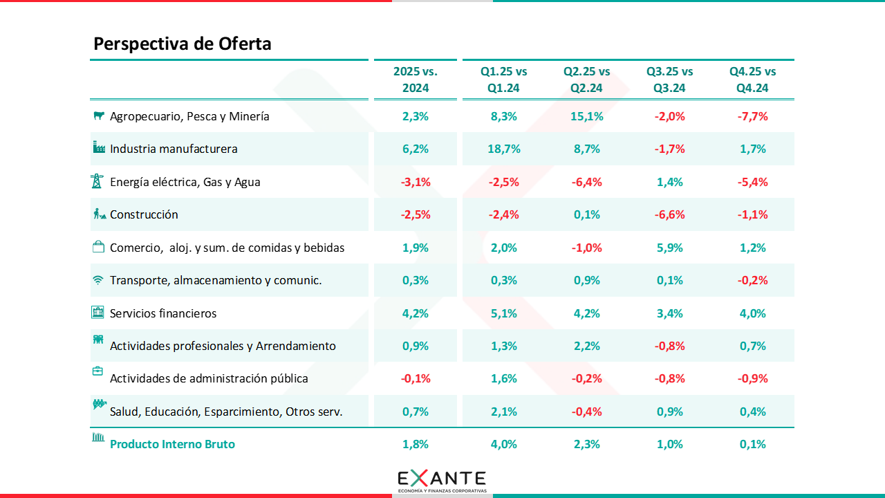 LM: Bueno, si nos quedamos en la comparación promedio anual, el crecimiento del año pasado estuvo impulsado por la industria (recogiendo principalmente el efecto refinería), por un buen verano 2025 a nivel del agro (que más que compensó los impactos preliminares de la sequía para este verano), así como por el crecimiento que mostró la actividad comercial y de los servicios financieros.