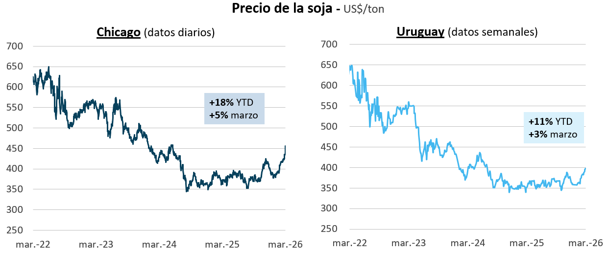 DM: Los precios de la soja local también subieron, pero en menor magnitud. De acuerdo con datos publicados por la Cámara Mercantil, en los últimos días las referencias estuvieron en unos US$ 400 la tonelada de soja, un precio 11% superior al del cierre de 2025 y que subió 3% desde el inicio de la guerra; como decía, subió, pero menos que en los mercados internacionales. Aquí puede estar jugando que en la región hay abundante oferta de soja disponible, con la entrada de la cosecha de Brasil en estas semanas.