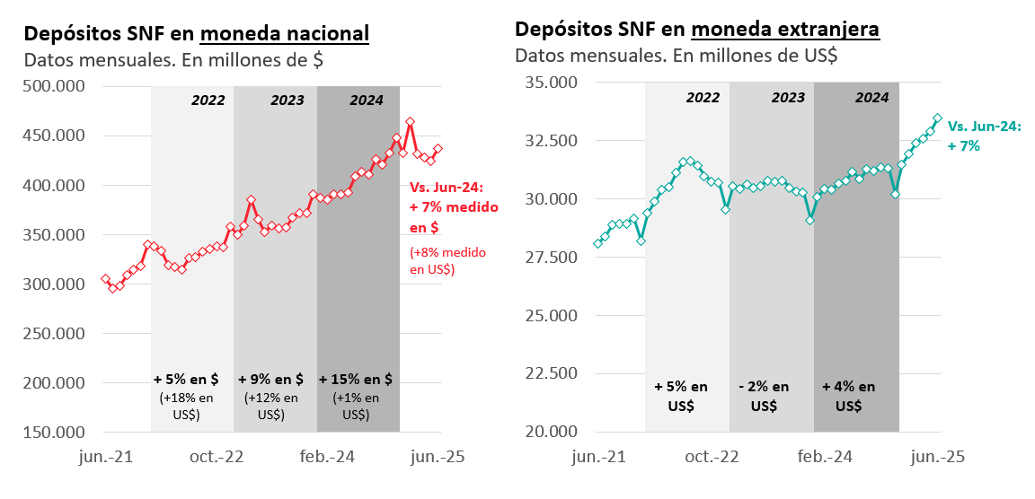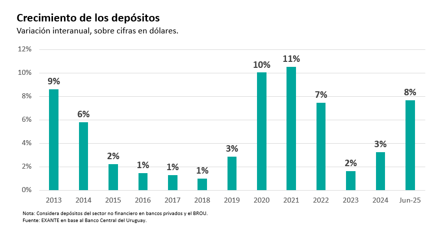 Es un aumento importante, sin dudas. Es más intenso que el que se había visto en 2023 y 2024, años en que los depósitos ya venían de hecho creciendo a un ritmo interesante, en el eje del 2-3% anual. Y de esta manera, se consolida un período bastante prolongado de aumento fuerte en el saldo depositado, que comenzó durante la pandemia y siguió en su salida, con incrementos que llegaron a ser de dos dígitos entre 2020 y 2022. Para tener otra referencia, los depósitos hoy equivalen a un 55% del PIB, cuando en 2019 no llegaban a un 50%.
