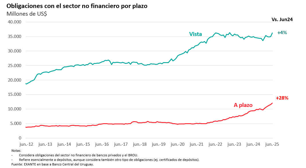 ALICIA CORCOLL (AC): Claro. Para ubicarnos, el saldo agregado de depósitos en bancos (considerando al BROU y a la banca privada) totalizaba a junio unos US$ 44.600 millones. Hay vaivenes mensuales, pero los depósitos subieron, por ejemplo, un 4% en el segundo trimestre del año y un 8% sí frente a junio de 2025.