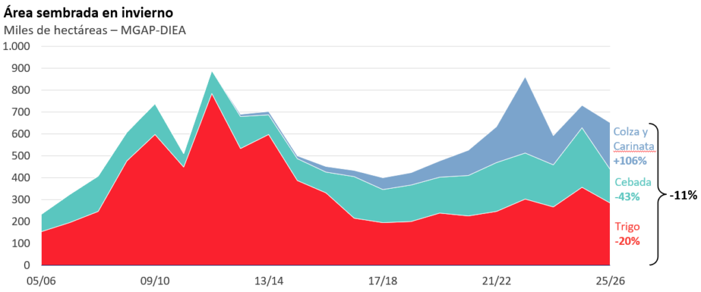 En la cebada el descenso del área sembrada fue de mayor magnitud, de más de 40%, en este caso sí situándose en los niveles más bajos de las últimas 8 zafras, en unas 154.000 hectáreas.