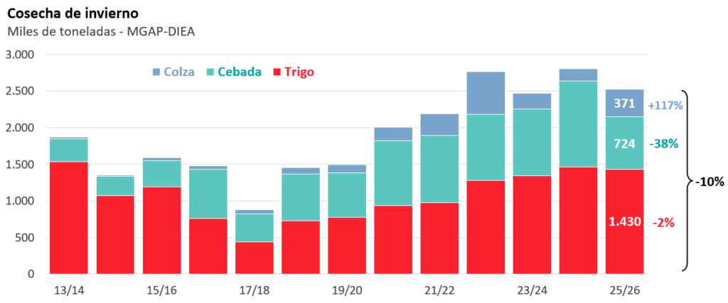Eso resultó en un descenso de 10% de la cosecha total de invierno en la zafra 2025/2026, recogiendo una leve baja en trigo, una reducción importante en la cebada y un gran crecimiento de la colza y carinata.