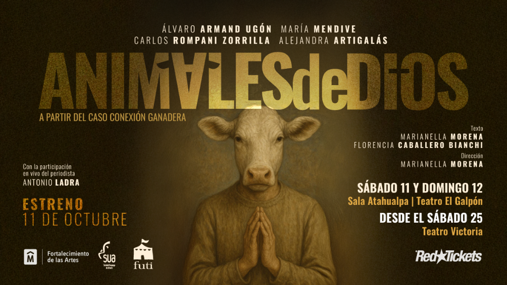 Inspirada en el caso real del fondo de inversión uruguayo Conexión Ganadera, Animales de Dios es la nueva creación de Marianella Morena, junto a Florencia Caballero Bianchi, que llega para sacudir certezas y poner en escena los límites y las trampas de la confianza.