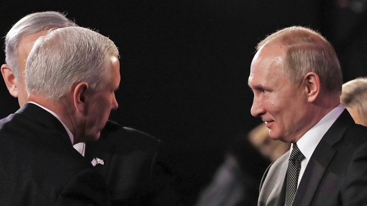 - US Vice President Mike Pence (L) greets Russian President Vladimir Putin (R) as they attend an even at Yad Vashem Holocaust memorial centre in Jerusalem on January 23, 2020, to mark 75 years since the liberation of Auschwitz, the World War II death camp where the Nazis killed more than 1.1 million people, most of them Jews. (Photo by RONEN ZVULUN / POOL / AFP)