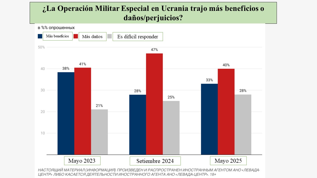 Sin embargo, desde una perspectiva sociológica y mediante encuestas recientes, se revela que la percepción social rusa de la guerra en Ucrania es compleja. Si bien una mayoría significativa aún apoya formalmente las decisiones del Kremlin, según diversos sondeos independientes como los realizados por el Centro Levada (considerado como el último centro de encuestas independiente en Rusia), existen resultados de opinión que no están atados a valores occidentales o siguen la misma hija de ruta raiconal que Occcidente.