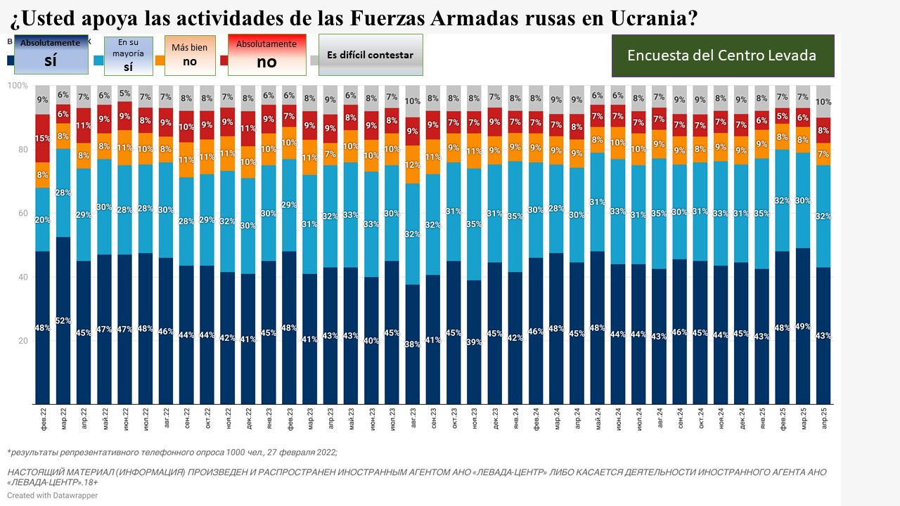 Sin embargo, desde una perspectiva sociológica y mediante encuestas recientes, se revela que la percepción social rusa de la guerra en Ucrania es compleja. Si bien una mayoría significativa aún apoya formalmente las decisiones del Kremlin, según diversos sondeos independientes como los realizados por el Centro Levada (considerado como el último centro de encuestas independiente en Rusia), existen resultados de opinión que no están atados a valores occidentales o siguen la misma hija de ruta raiconal que Occcidente.