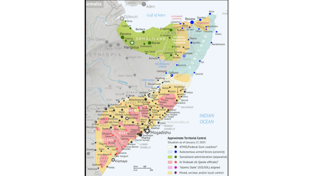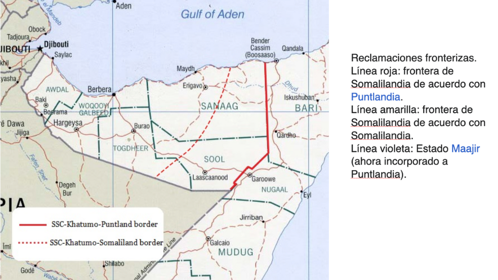 Geográficamente, limita al norte con el golfo de Adén, al oeste con Yibuti, al sur y sureste con Somalia, y al suroeste con Etiopía, lo que le otorga una ubicación estratégica en rutas marítimas clave y en un entorno geopolítico complejo, influido por la inestabilidad del Cuerno de África, la proximidad a la Península Arábiga y la competencia por el control de puertos y corredores comerciales.