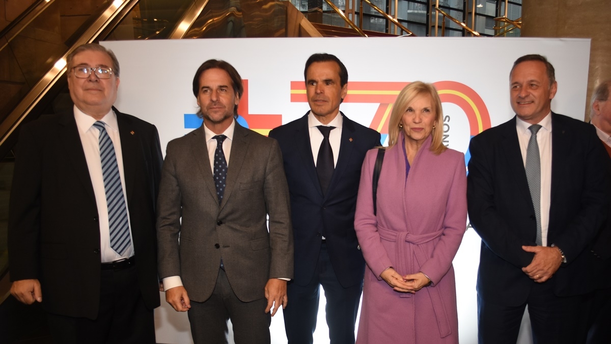 - Dr. Julio Martínez (Gerente General de la Asociación Española), Dr. Luis Lacalle Pou (Presidente de la República), Sr. Fernando García (Presidente del Consejo Directivo de la Asociación Española), Sra. Beatriz Argimón (Vice Presidenta de la República) y Sr. Alvaro Delgado (Secretario de Presidencia)
