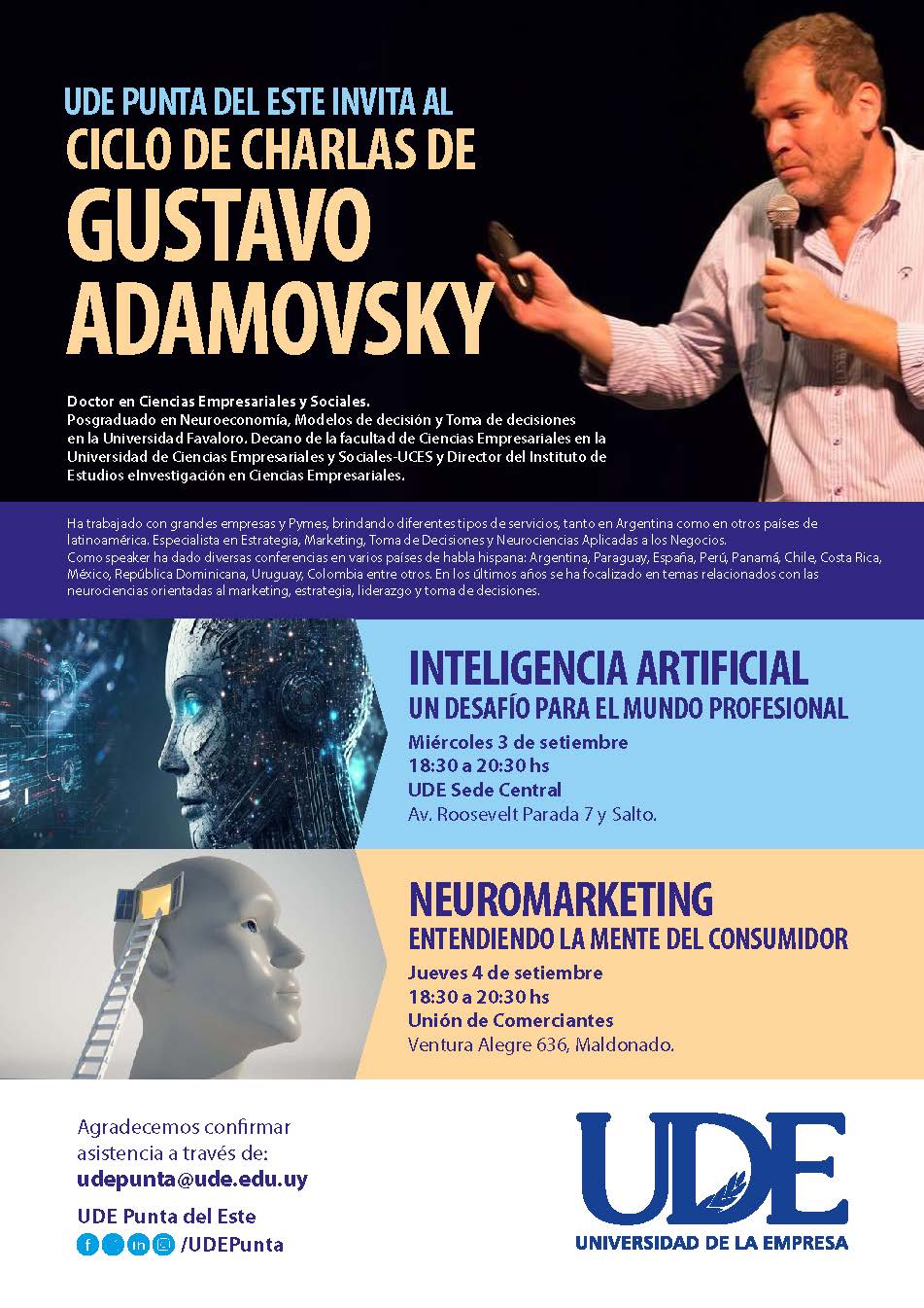 La Universidad de la Empresa (UDE) Punta del Este anunció un nuevo ciclo de conferencias abiertas al público, a cargo del reconocido especialista internacional Dr. Gustavo Adamovsky, doctor en Ciencias Empresariales y Sociales, posgraduado en Neuroeconomía y referente en estrategia, marketing y neurociencias aplicadas a los negocios.